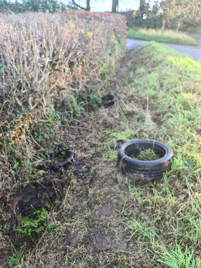 Over the course of a four-hour walk to the next village and beyond, a distance spanning 7.3km (or 14.6 km of hedgerows given that I cleared both sides) – I collected large 6 bags’ worth of litter, as well as three tyres!!